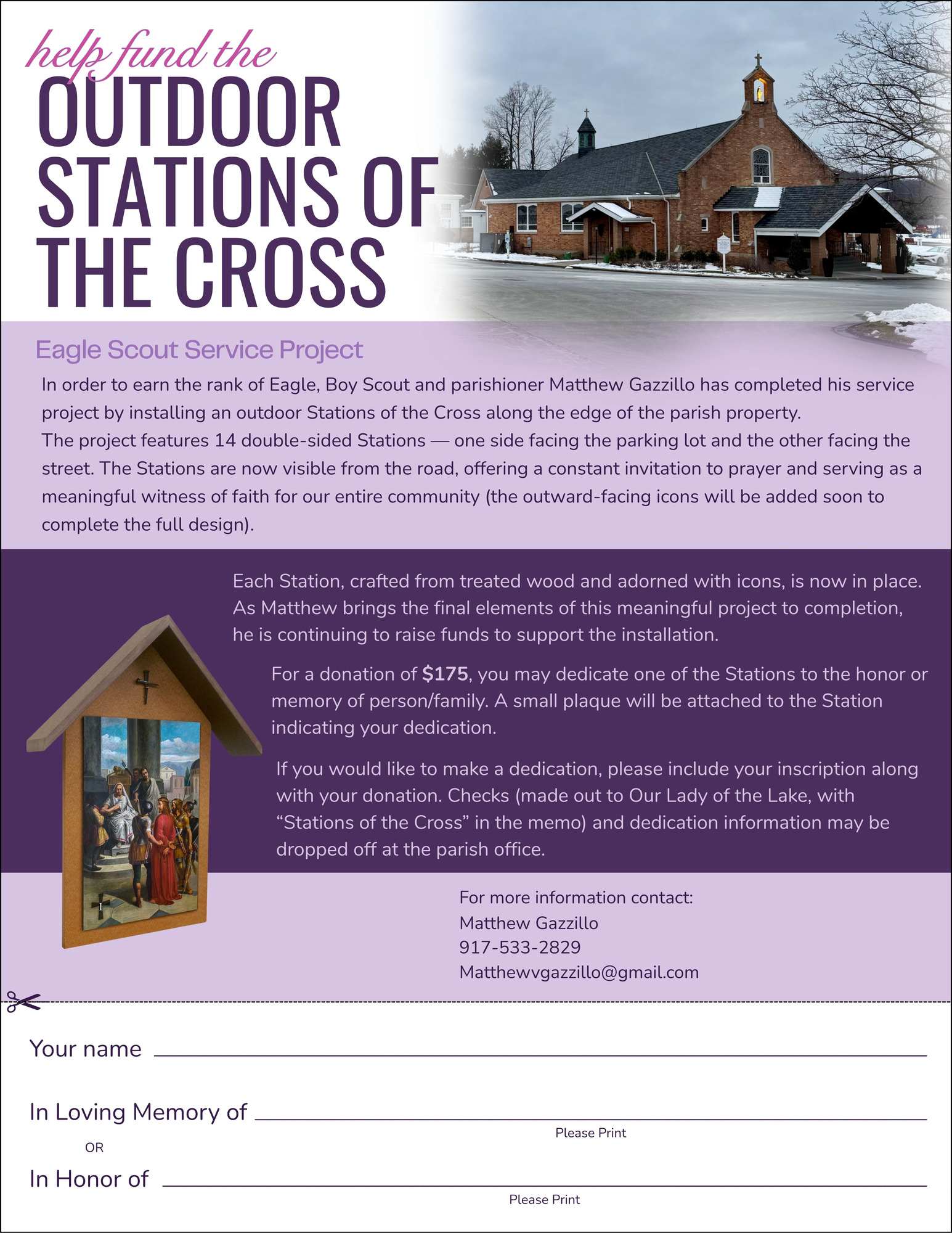 Matthew is still raising funds to complete the project. If you wish to make a donation or dedication, please include your inscription. Checks may be made out to Our Lady of the Lake with “Stations of the Cross” in the memo and dropped off at the parish office. For more information: